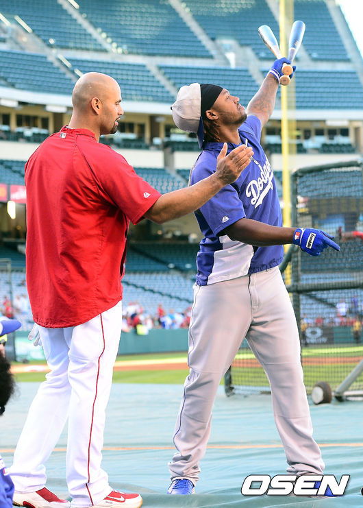 7일(한국시간) 미국 캘리포니아주 애너하임 에인절스타디움에서 열리는 '2014 메이저리그' LA 에인절스와 LA 다저스의 경기에 앞서 다저스 라미레즈가 전날 동점 솔로홈런을 때린 푸홀스의 폼을 따라하고 있다.