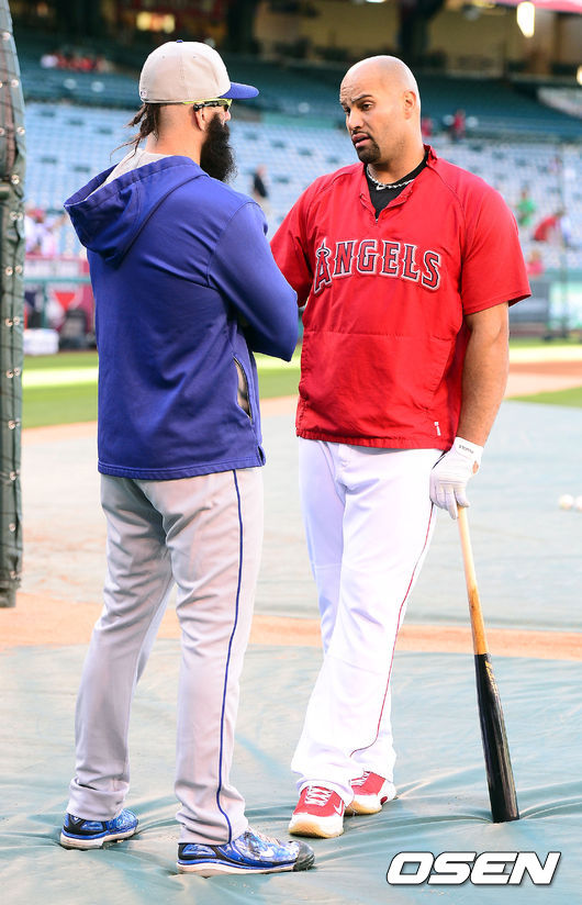 7일(한국시간) 미국 캘리포니아주 애너하임 에인절스타디움에서 열리는 '2014 메이저리그' LA 에인절스와 LA 다저스의 경기에 앞서 다저스 윌슨과 에인절스 푸홀스가 이야기를 나누고 있다.