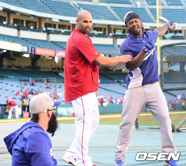 7일(한국시간) 미국 캘리포니아주 애너하임 에인절스타디움에서 열리는 '2014 메이저리그' LA 에인절스와 LA 다저스의 경기에 앞서 다저스 라미레즈가 전날 윌슨을 상대로 동점 홈런을 때린 푸홀스의 타격폼을 따라하고 있다.