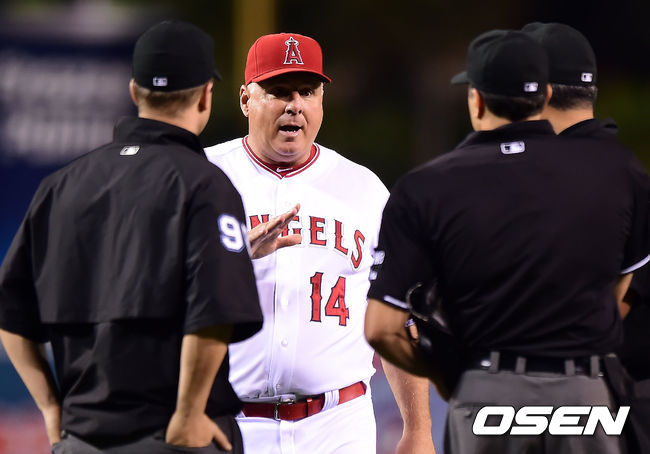 4회초 무사 1,2루 에인절스 소시아 감독이 터너의 투수 앞 땅볼때 2루에서 세이프 선언이 된 이디어의 판정에 비디오 판독을 요청하고 있다.