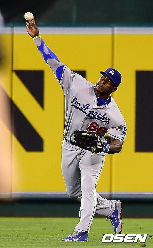 8회말 1사 1,3루 다저스 푸이그가 이아네타의 타구를 잡아낸 뒤 홈으로 송구하고 있다.