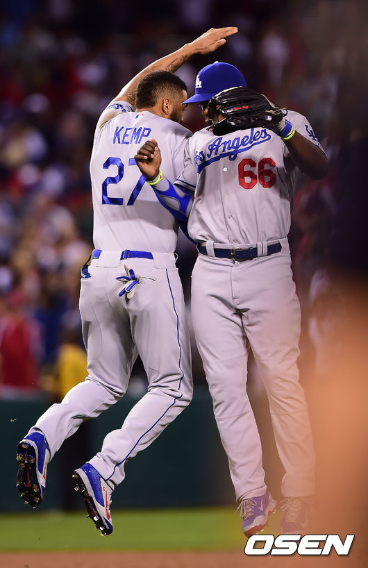 승리를 거둔 다저스 켐프와 푸이그가 기뻐하고 있다./youngrae@osen.co.kr