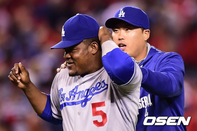 다저스 류현진이 유리베와 장난을 치며 그라운드를 나서고 있다./youngrae@osen.co.kr