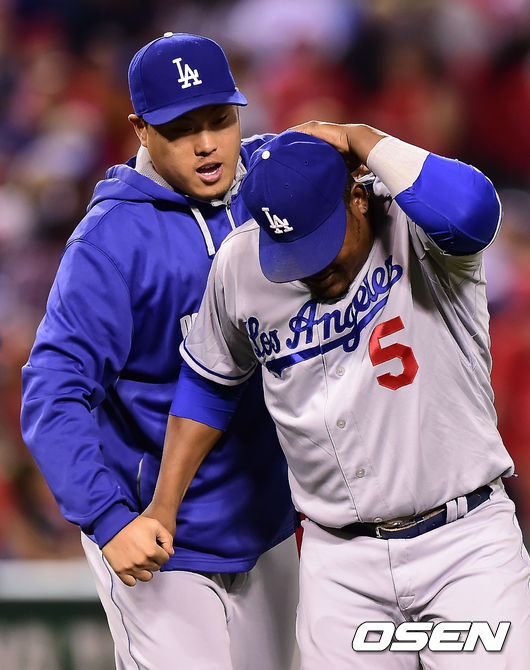 다저스 류현진이 유리베와 장난을 치며 그라운드를 나서고 있다./youngrae@osen.co.kr