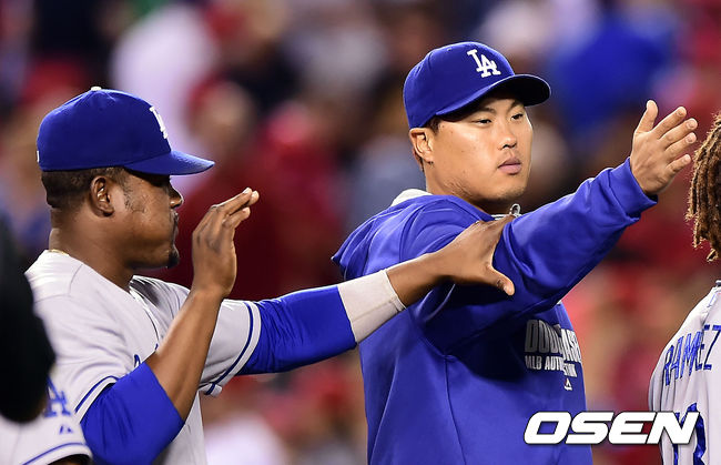 다저스 유리베와 류현진이 장난을 치고 있다./youngrae@osen.co.kr