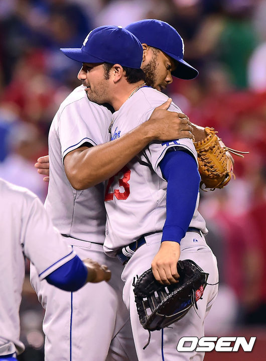 승리를 거둔 다저스 잰슨과 곤잘레스와 포옹을하고 있다./youngrae@osen.co.kr