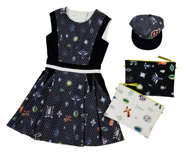 보석 사탕을 연상케 하는 잠자리, 플라워, 바닐라비 로고 등의 유쾌한 프린팅에 오렌지, 라임, 블루, 퍼플 등의 색상이 조합 돼 상큼한 이미지를 만들어 준다. 네이비 혹은 화이트 컬러와 보석 프린팅의 조합은 깔끔하고 이지적인 느낌을, 패턴 페브릭과 보석 프린팅의 조합은 보다 화려하고 고급스러운 느낌이 강조된다.