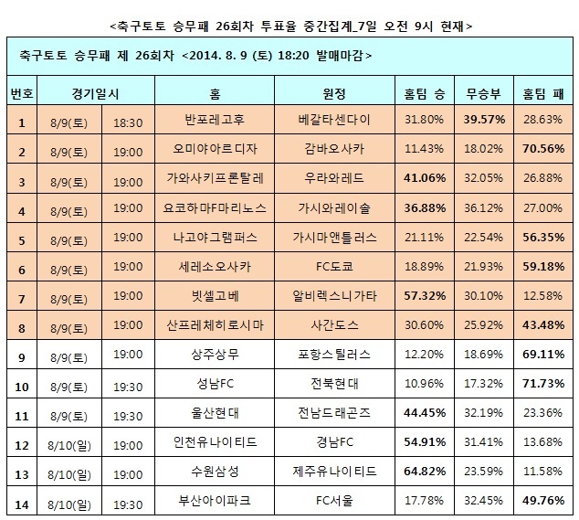 [축구토토] 국민체육진흥공단(www.kspo.or.kr)이 발행하는 체육진흥투표권 수탁사업자인 스포츠토토 온라인 공식 발매사이트 베트맨(www.betman.co.kr)은 오는 9일과 10일 벌어지는 K-리그 클래식 6경기 및 J-리그 8경기 등 총 14경기를 대상으로 한 축구토토 승무패 26회차 투표율 중간집계 결과, K-리그 클래식 성남-전북(10경기)전에서 국내 축구팬 71.73%가 전북의 승리를 점쳤다고 밝혔다.