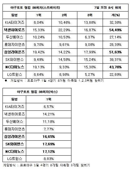 한편 순위에 상관없이 다득점 3개팀만을 맞히는 '박스' 게임에서는 SK(17.69%)가 1순위를 차지한 가운데, NC(17.12%)와 삼성(16.65%)이 뒤를 이었다.