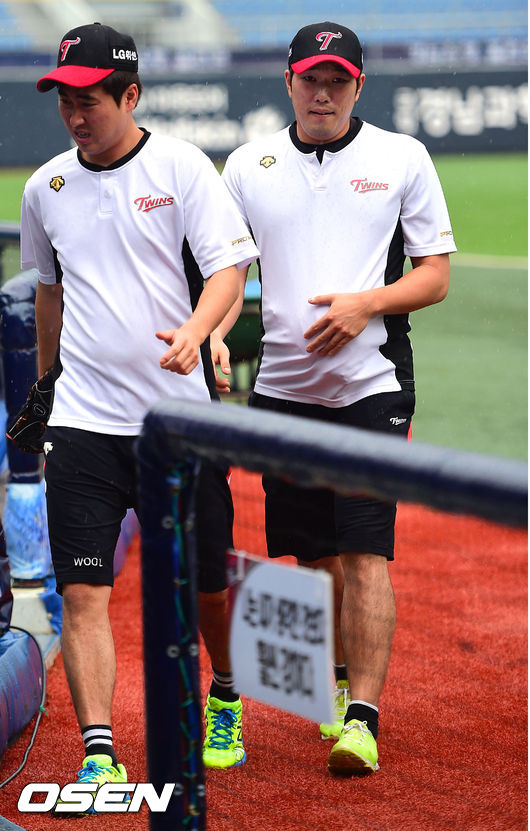 7일 경남 창원 마산구장에서 열리는 2014 한국야쿠르트 세븐 프로야구 NC 다이노스와 LG 트윈스의 경기에 앞서 갑자기 내리는 비에 LG 유원상이 글러브를 유니폼 속에 숨긴채 더그아웃으로 들어가고 있다.