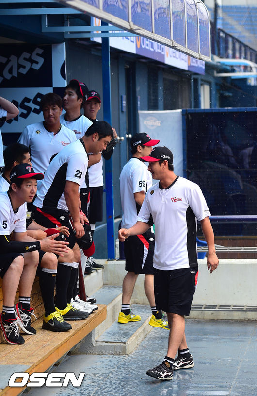 7일 경남 창원 마산구장에서 열리는 2014 한국야쿠르트 세븐 프로야구 NC 다이노스와 LG 트윈스의 경기에 앞서 갑자기 내리는 비에 LG 선수들이 더그아웃에서 대기하고 있다