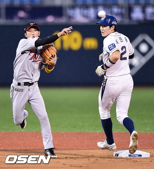 7일 경남 창원 마산구장에서 열린 2014 한국야쿠르트 세븐 프로야구 NC 다이노스와 LG 트윈스의 경기, 1회말 무사 1루 NC 이종욱의 병살타때 LG 황목치승 유격수가 1루 주자 김민우를 포스아웃시킨뒤 1루로 송구하고 있다.