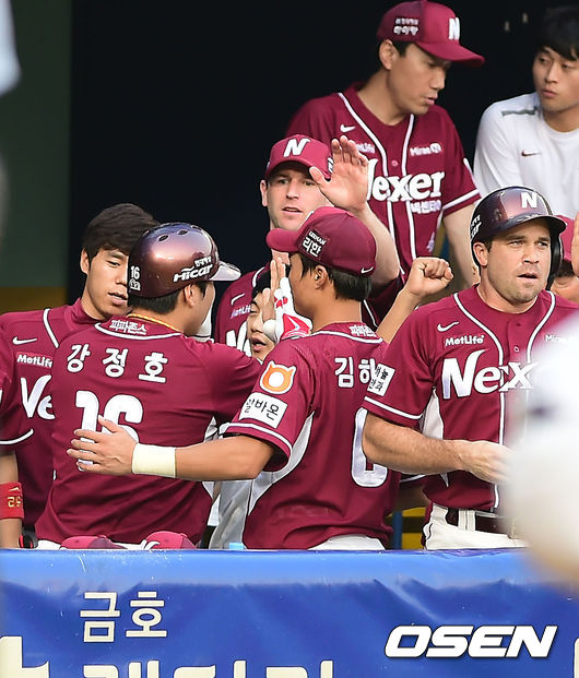7일 오후 잠실 야구장에서 열린 '2014 한국야쿠르트 세븐 프로야구' 두산 베어스와 넥센 히어로즈의 경기, 2회초 1사 주자 없는 상황에서 넥센 강정호가 두산 선발 마야를 상대로 좌월 선취 솔로홈런을 날린 후 덕아웃에서 동료들과 하이파이브를 하고 있다.