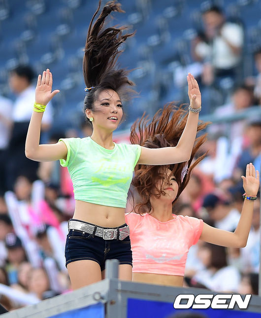 7일 오후 잠실 야구장에서 열린 '2014 한국야쿠르트 세븐 프로야구' 두산 베어스와 넥센 히어로즈의 경기, 두산 치어리더들이 화려한 공연을 펼치고 있다.