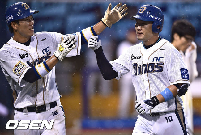 7일 경남 창원 마산구장에서 열린 2014 한국야쿠르트 세븐 프로야구 NC 다이노스와 LG 트윈스의 경기, 2회말 2사 3루 NC 지석훈이 2점 홈런을 날리고 3루 주자 모창민과 하이파이브르 하고 있다.