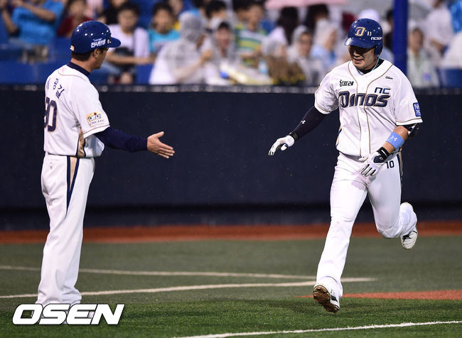 7일 경남 창원 마산구장에서 열린 2014 한국야쿠르트 세븐 프로야구 NC 다이노스와 LG 트윈스의 경기, 2회말 2사 3루 NC 지석훈이 2점 홈런을 날리고 베이스를 돌고 있다.