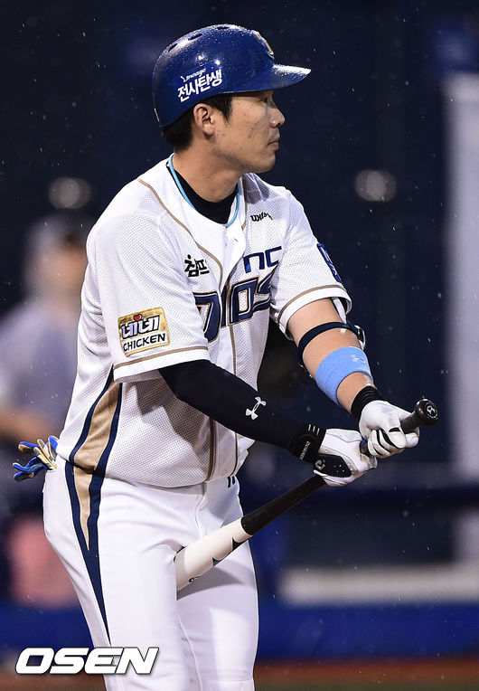 7일 경남 창원 마산구장에서 열린 2014 한국야쿠르트 세븐 프로야구 NC 다이노스와 LG 트윈스의 경기, 2회말 2사 NC 지석훈이 방망이의 물기를 제거하고 있다.
