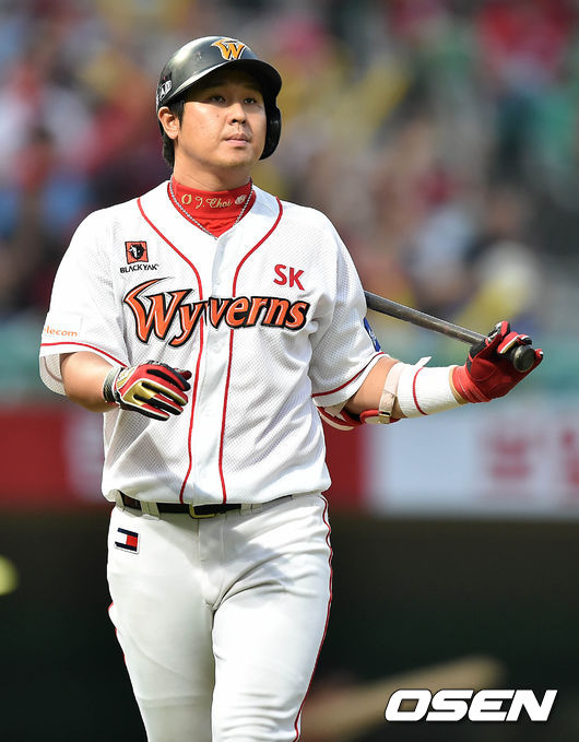 3회말 2사 1루에서 SK 최정이 라인드라이브 아웃으로 물러나며 더그아웃으로 가고 있다.