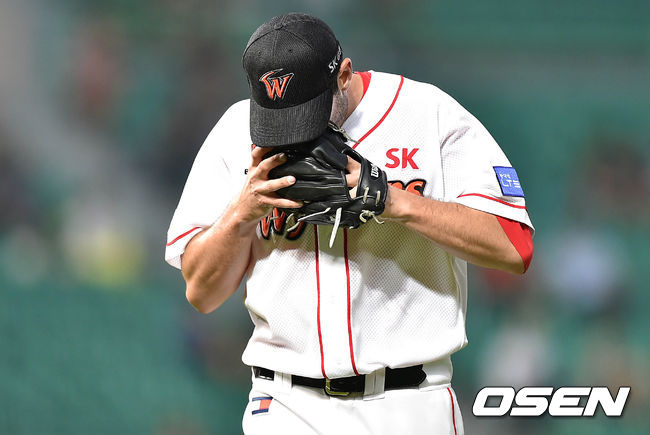 4회초 2사 만루에서 SK 밴와트가 KIA 강한울을 내야땅볼로 처리하고 더그아웃으로 가고 있다.