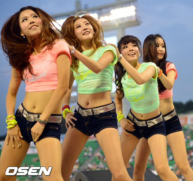 7일 오후 잠실 야구장에서 열린 '2014 한국야쿠르트 세븐 프로야구' 두산 베어스와 넥센 히어로즈의 경기, 두산 치어리더들이 화려한 공연을 펼치고 있다.