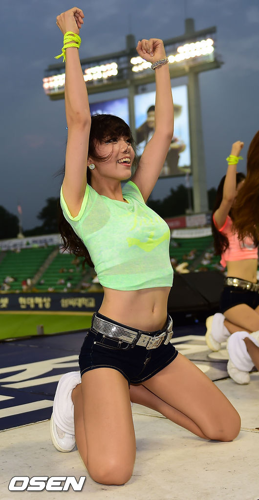 7일 오후 잠실 야구장에서 열린 '2014 한국야쿠르트 세븐 프로야구' 두산 베어스와 넥센 히어로즈의 경기, 두산 치어리더들이 화려한 공연을 펼치고 있다.