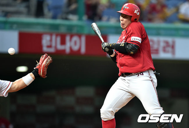 4회초 무사 1루에서 KIA 나지완이 SK 밴와트의 투그를 맞고 있다.
