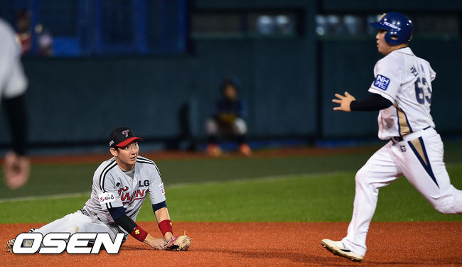 7일 경남 창원 마산구장에서 열린 2014 한국야쿠르트 세븐 프로야구 NC 다이노스와 LG 트윈스의 경기, 4회말 1사 만루 NC 지석훈의 강습타구에 맞은 LG 손주인이 쓰러져 있다. 그 사이 NC는 득점, 주자 타자는 모두 세이프.