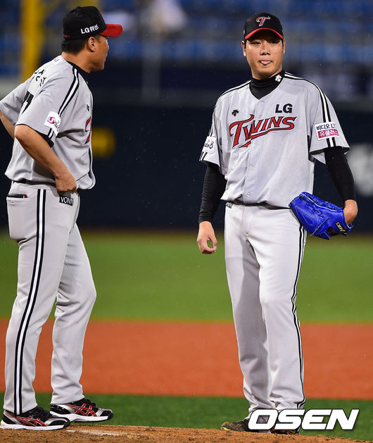 7일 경남 창원 마산구장에서 열린 2014 한국야쿠르트 세븐 프로야구 NC 다이노스와 LG 트윈스의 경기, 4회말 LG 선발투수 류제국이 강상수 코치와 이야기를 나누고 있다