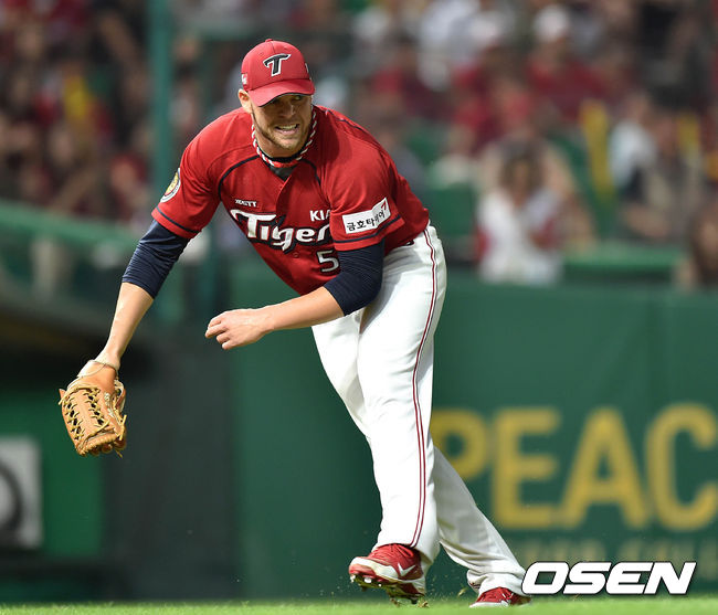5회말 무사 1,2루 KIA 토마스가 SK 정상호의 번트 타구를 잡아 1루로 송구했지만 공이 빠져 실점을 허용했다.