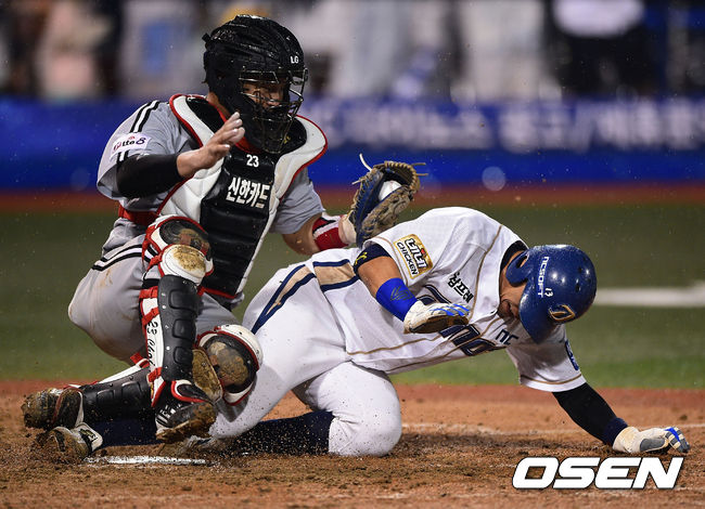 7일 경남 창원 마산구장에서 열린 2014 한국야쿠르트 세븐 프로야구 NC 다이노스와 LG 트윈스의 경기, 5회말 무사 1루 NC 나성범의 1타점 2루타때 1루 주자 이종욱이 홈에서 세이프 되고 있다.