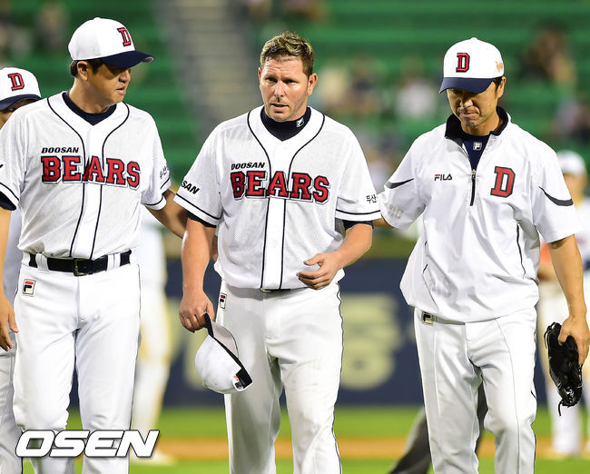 7일 오후 잠실 야구장에서 열린 '2014 한국야쿠르트 세븐 프로야구' 두산 베어스와 넥센 히어로즈의 경기, 5회초 넥센 선두타자 유한준 타석에서 볼을 던지던 두산 선발 마야가 팔의 고통을 호소하며 교체되고 있다.