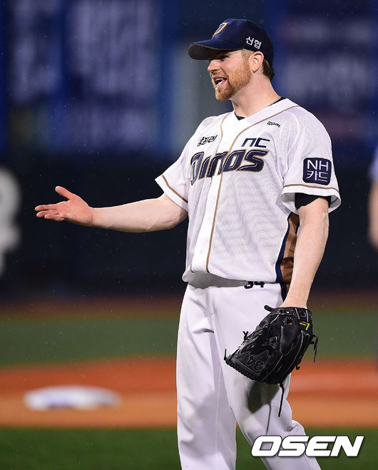 7일 경남 창원 마산구장에서 열린 2014 한국야쿠르트 세븐 프로야구 NC 다이노스와 LG 트윈스의 경기, 6회초 무사 2루 LG 이병규에게 몸에 맞는 공을 던진 NC 선발투수 에릭이 판정에 항의하고 있다.