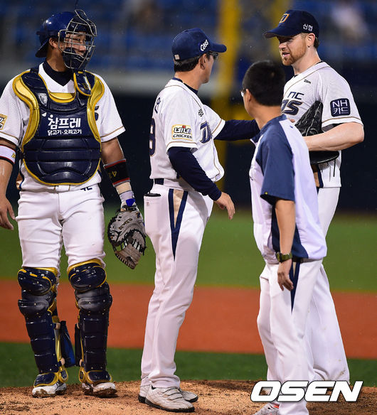7일 경남 창원 마산구장에서 열린 2014 한국야쿠르트 세븐 프로야구 NC 다이노스와 LG 트윈스의 경기,6회초 무사 1,2루 위기에서 NC 선발투수 에릭이 최일언 투수코치와 마운드에서 이야기를 나누고 있다.