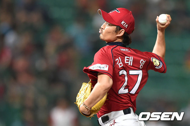 6회말 무사에서 KIA 김태영이 힘차게 공을 던지고 있다.