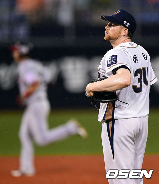 7일 경남 창원 마산구장에서 열린 2014 한국야쿠르트 세븐 프로야구 NC 다이노스와 LG 트윈스의 경기, 6회초 2사 1,2루 LG 손주인에게 3점 홈런을 허용한 NC 선발투수 에릭이 아쉬워하고 있다.