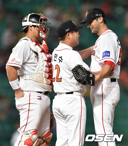 7회초 1사 1루에서 마운드를 방문한 SK 이만수 감독이 밴와트와 이야기를 나누고 있다.