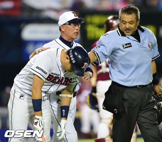 7일 오후 잠실 야구장에서 열린 '2014 한국야쿠르트 세븐 프로야구' 두산 베어스와 넥센 히어로즈의 경기, 5회말 1사 주자 1루 두산 양의지가 타석에서 넥센 김영민에게 볼을 맞은 후 걸어나오자 김풍기 구심과 두산 송일수 감독이 양의지를 말리고 있다.