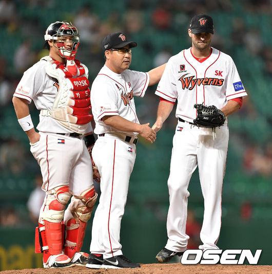 7회초 1사 1루에서 SK 밴와트가 마운드를 내려가고 있다.