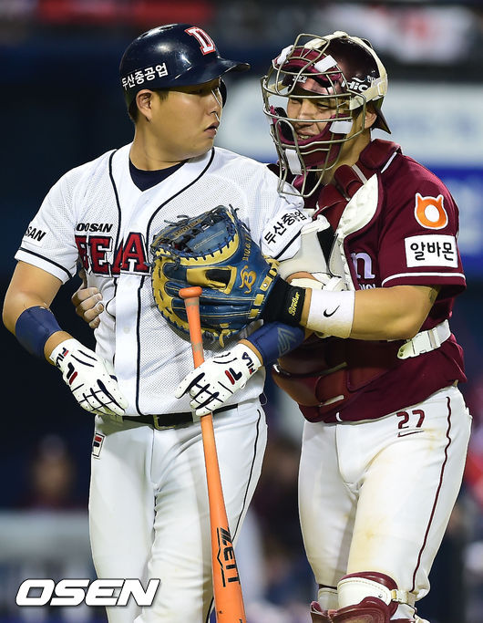 7일 오후 잠실 야구장에서 열린 '2014 한국야쿠르트 세븐 프로야구' 두산 베어스와 넥센 히어로즈의 경기, 5회말 1사 주자 1루 두산 양의지가 타석에서 넥센 김영민에게 볼을 맞은 후 걸어나오자 박동원 포수가 양의지를 말리고 있다.