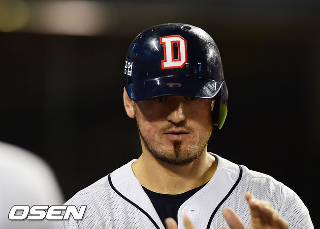 7일 오후 잠실 야구장에서 열린 '2014 한국야쿠르트 세븐 프로야구' 두산 베어스와 넥센 히어로즈의 경기, 5회말 2사 주자 1,2루 두산 이원석의 좌익수 앞 1타점 적시타때 홈을 밟은 칸투가 덕아웃에서 동료들과 하이파이브를 하고 있다.