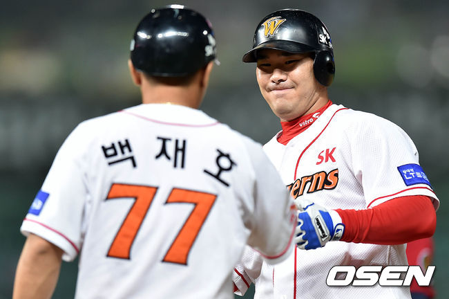 7회말 1사 1,2루에서 SK 이재원이 좌중간 적시타를 치고 백재호 코치와 하이파이브를 하고 있다.