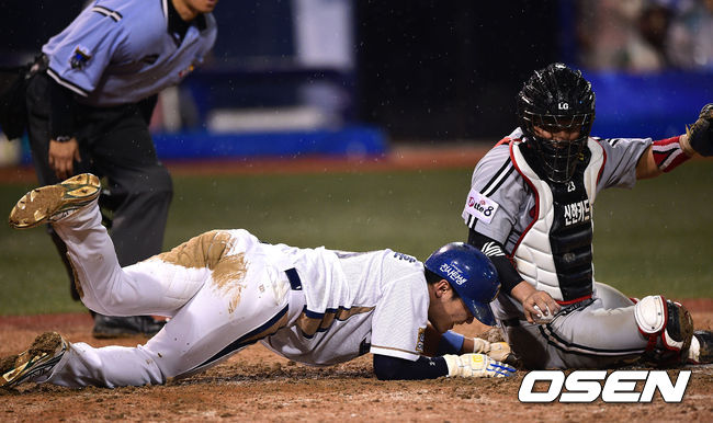 7일 경남 창원 마산구장에서 열린 2014 한국야쿠르트 세븐 프로야구 NC 다이노스와 LG 트윈스의 경기, 6회말 2사 2루 NC 박민우의 안타때 LG 최경철이 2루 주자 지석훈을 태그아웃 시키고 있다.