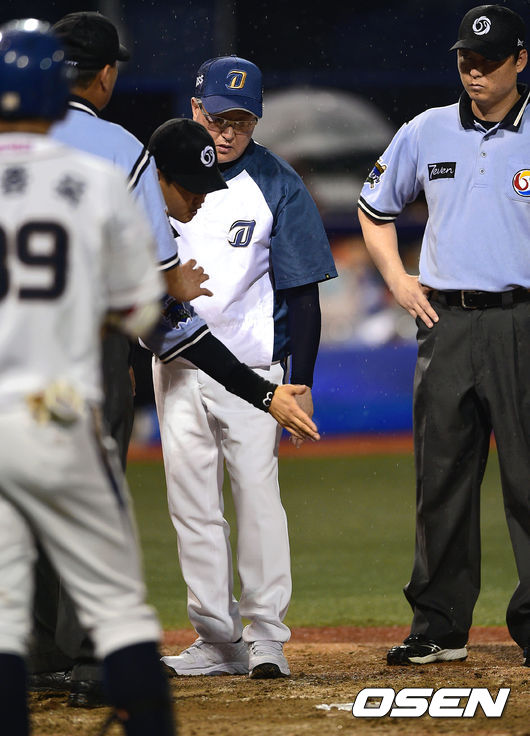 7일 경남 창원 마산구장에서 열린 2014 한국야쿠르트 세븐 프로야구 NC 다이노스와 LG 트윈스의 경기, 6회말 2사 2루 NC 박민우의 안타때 2루 주자 지석훈이 홈에서 태그아웃됐다. 김경문이 이기중 구심에게 항의하고 있다.