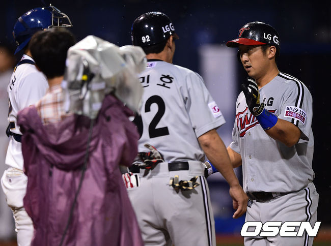 7일 경남 창원 마산구장에서 열린 2014 한국야쿠르트 세븐 프로야구 NC 다이노스와 LG 트윈스의 경기, 7회초 무사 1루 LG 이병규가 동점 2점 홈런을 날린후 동료들의 축하를 받고 있다.
