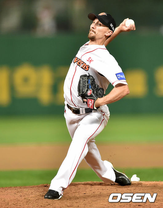 8회초 2사 1루에서 SK 울프가 힘차게 공을 던지고 있다.
