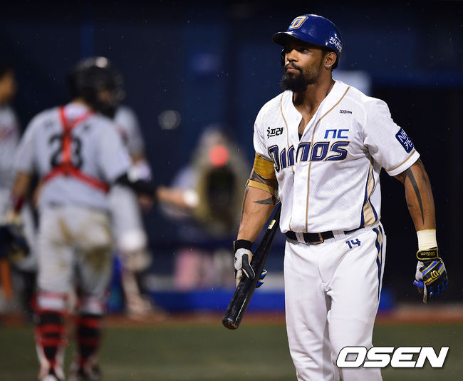 7일 경남 창원 마산구장에서 열린 2014 한국야쿠르트 세븐 프로야구 NC 다이노스와 LG 트윈스의 경기, 7회말 NC 테임즈가 교체 출전했지만 삼진아웃 당하자 아쉬워하고 있다.