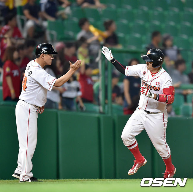 8회말 1사에서 SK 나주환이 중월 솔로 홈런을 치고 그라운드를 돌고 있다.