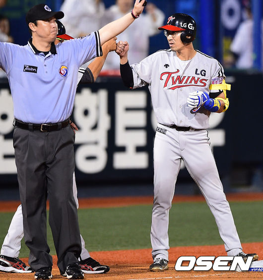 7일 경남 창원 마산구장에서 열린 2014 한국야쿠르트 세븐 프로야구 NC 다이노스와 LG 트윈스의 경기, 8회초 1사 2루 LG 정성훈이 역전 1타점 3루타를 날리고 최태원 코치와 하이파이브를 하고 있다.