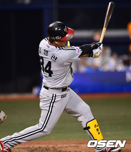 7일 경남 창원 마산구장에서 열린 2014 한국야쿠르트 세븐 프로야구 NC 다이노스와 LG 트윈스의 경기, 8회초 1사 3루 LG 김영관이 1타점 3루타를 날리고 있다.