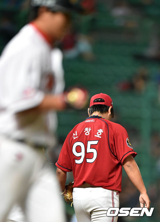 8회말 1사 만루에서 KIA 신창호가 SK 최정에 밀어내기 볼넷을 허용하고 있다.